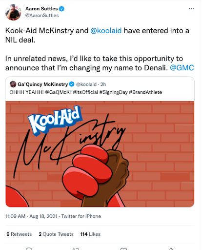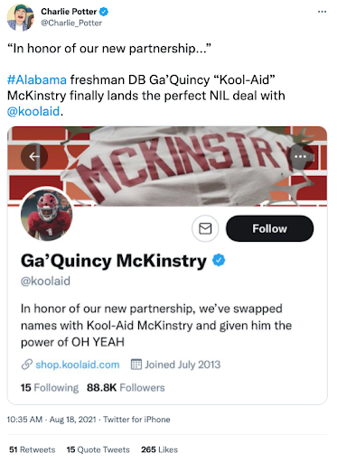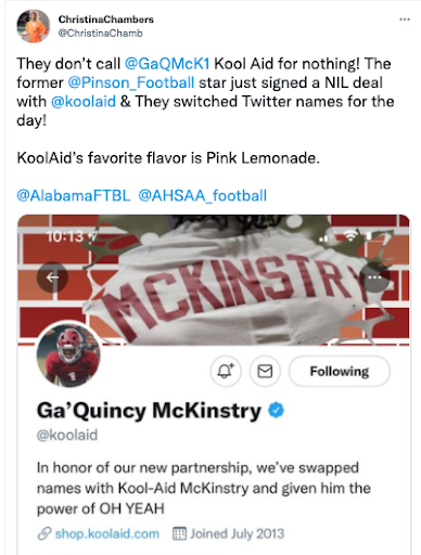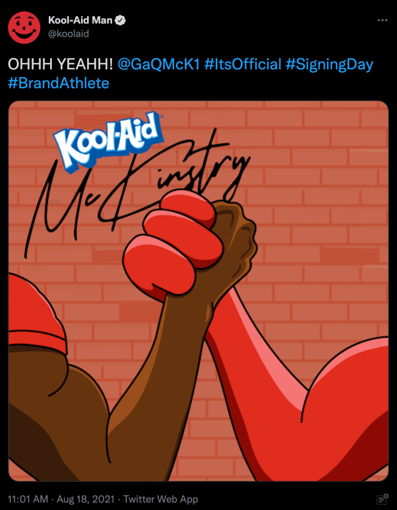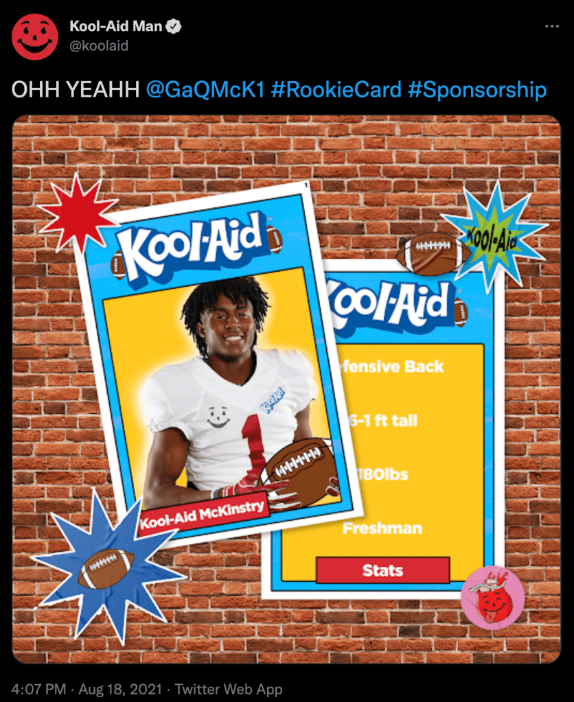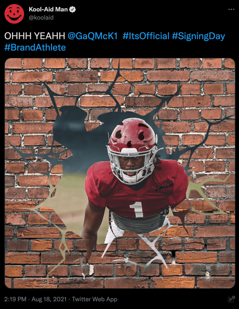 In August 2021, shortly after the NCAA’s NIL policy change, we orchestrated one of the most culturally resonant athlete-brand collaborations to date. Alabama freshman cornerback Ga’Quincy McKinstry, affectionately known as “Kool-Aid”, a nickname given by his grandmother for his ever-present smile, partnered with the Kool-Aid brand in a synergy that felt destined. To announce the partnership, we executed a creative social media campaign where Kool-Aid and McKinstry temporarily swapped their Twitter and Instagram names. This playful exchange not only celebrated the deal but also generated significant buzz across platforms. McKinstry embraced the brand wholeheartedly, even donning a Kool-Aid Man chain at SEC Media Days.This collaboration was lauded as one of the most fitting and memorable NIL deals, seamlessly blending personal identity with brand storytelling. Agency: Vaynermedia