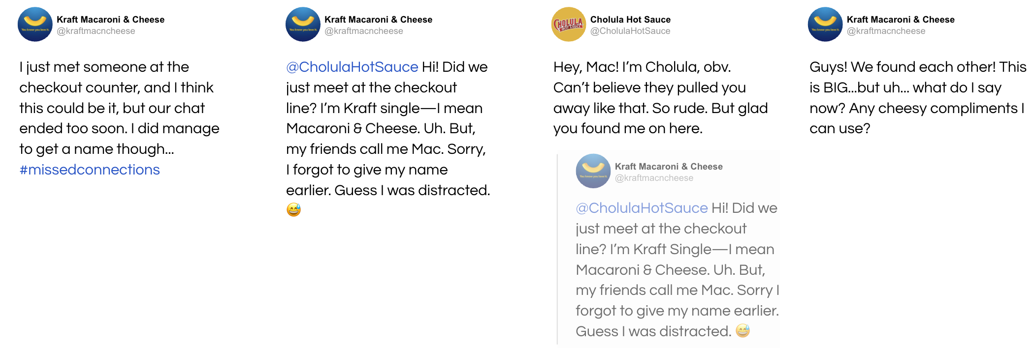 In December 2020, Kraft teamed up with Cholula for a spicy OLV campaign spotlighting the cult-favorite combo of hot sauce and mac & cheese. I helped drive the creative through playful cross-account social banter, which built momentum toward a limited-time bundle promotion featuring both brands. From social chatter to campaign launch, it was a full-circle moment of sauce and strategy.